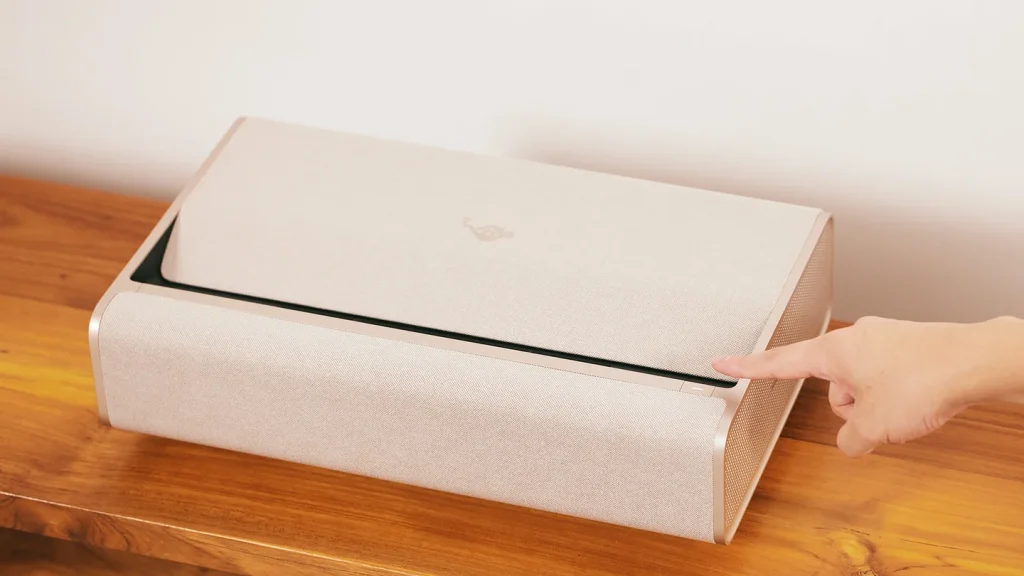 「Aladdin Marca」は、Aladdin Marca Maxと同シリーズのエントリーモデルで、壁から24cmで100インチの大画面を映し出せる超短焦点プロジェクターです。シンプルで洗練されたデザインによりインテリアにもなじみやすく、自然にリビングに溶け込む使い方が可能です。Aladdin X独自のオリジナルアプリも搭載し、映像鑑賞だけでなく、生活のあらゆるシーンに寄り添う存在として活躍します。