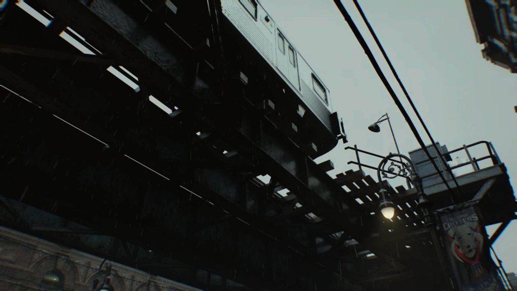 この冒頭の街中を歩くだけのシーンでは頭上を列車が走っています。当然、この列車にも「オブジェクト」として音の位置情報が与えられています。頭上の音は天井スピーカーから聴こえ、視界に映っていなくても音で頭上を列車が走っているとプレイヤーは認識できます。そして、頭上の音に釣られて実際にカメラを上に向けてみると、本当に頭上を列車が走っているという、まるで現実のようなリアルさがあります。