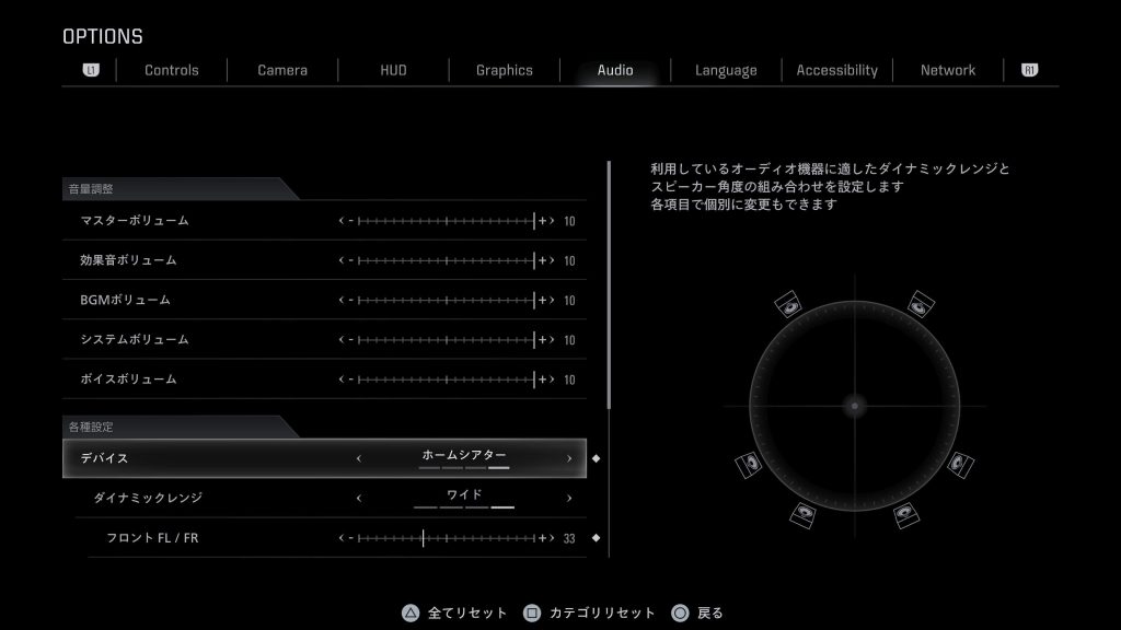 ゲームを起動し、タイトル画面の [OPTIONS] > [Audio] > [デバイス] を 「ホームシアター」 に変更します。