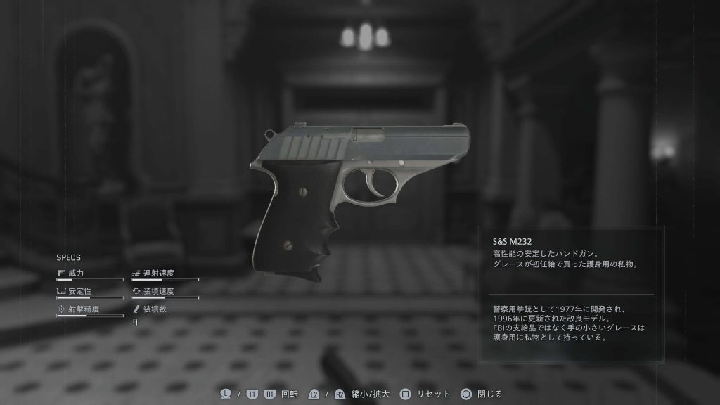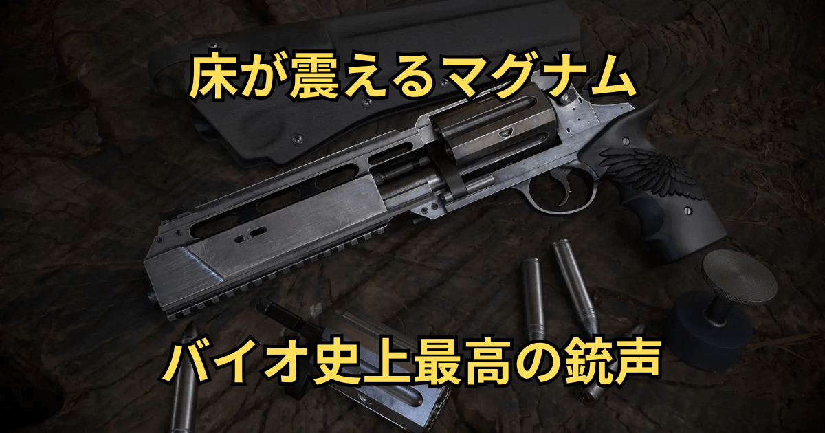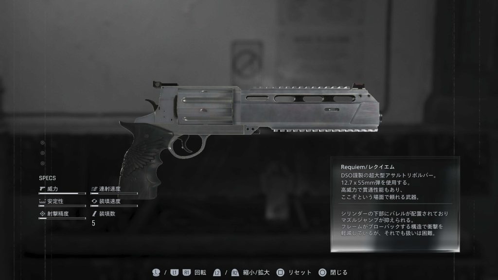 本作に登場するマグナム(レクイエム)は、いわゆる市販のマグナム拳銃ではなく、対BOW用に専用開発された「特殊兵器」という位置付けです。バイオシリーズお馴染みの表現でいうなら「ハンドキャノン」といった言葉がピッタリです。ゲーム内の説明文には「謹製」という言葉が使われており、一般的な対BOW用兵器とは一線を画す、レオンのようなスペシャルエージェントのために開発された「さらに特別な一丁」という意味合いだと思われます。