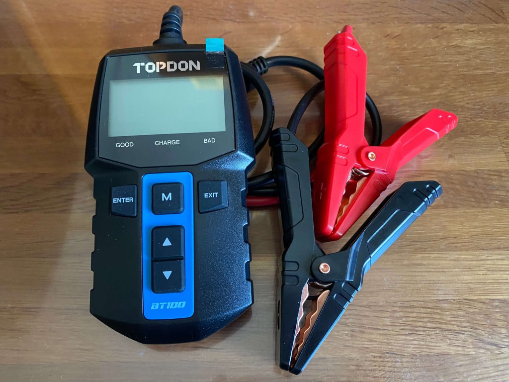 今回使用するCCAテスターは、「TOPDON BT100」です。写真に見えるクリップをバッテリーのプラス端子とマイナス端子に繋げば各種測定が可能です。電源スイッチや電池はなく、バッテリーに繋ぐことで本体が起動します。
