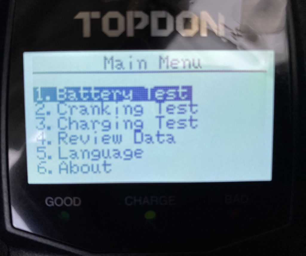 テスターの画面が表示されたら先ずは測定項目を選択します。「Battery Test」を選択して「ENTER」ボタンを押します。