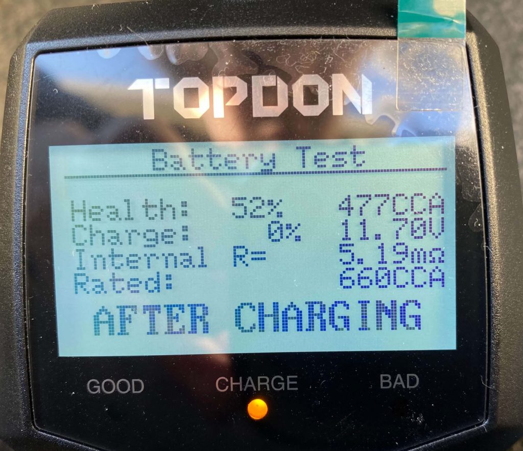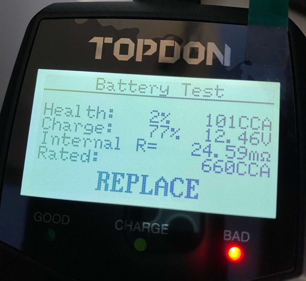 この写真は筆者がCCAテスターで実際にバッテリーのCCA値を測定した結果ですが、CCA値だけ見るとバッテリーの健康状態が2%で「要交換」ですが、後でこれが誤判定であることに気づきます。着目すべき点は、CCA値ではなく内部抵抗「24.59mΩ」の方だったのです。