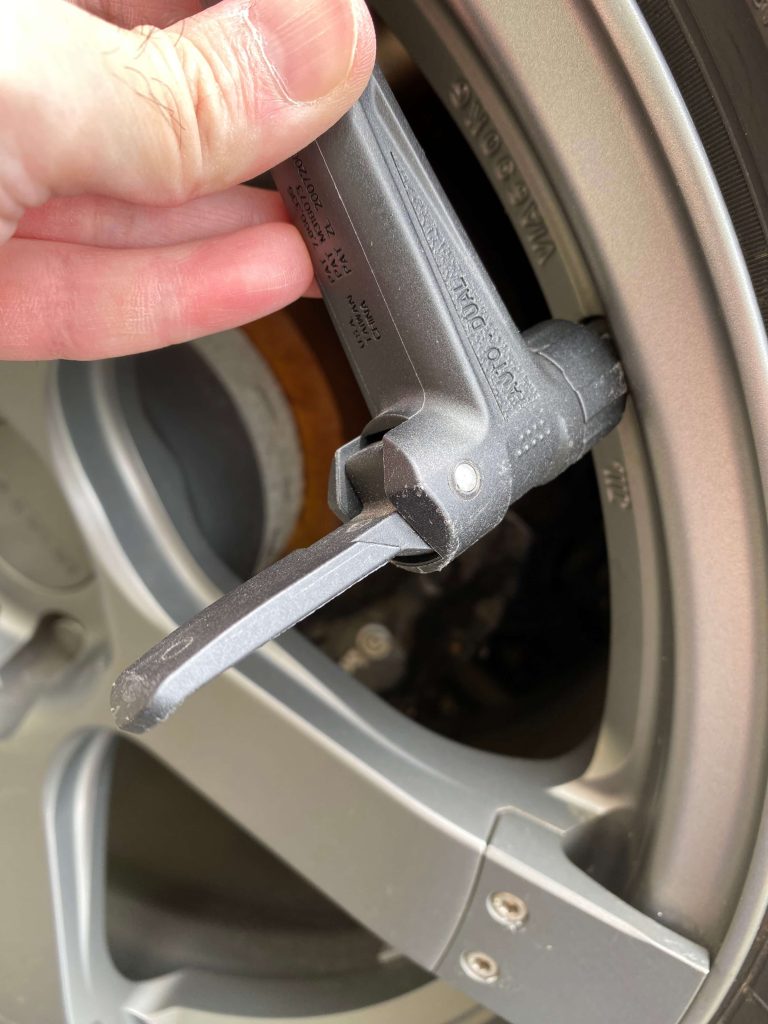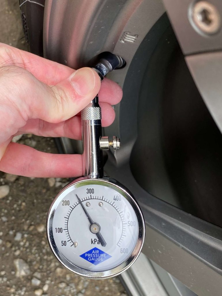 ホイールのエアバルブに付いているキャップを外してエアゲージでタイヤの空気圧をチェックします。エアバルブとエアゲージが平行になるように接地させて、エアゲージを強く押し付けて、そのまま押しっぱなしにしてエアゲージのメモリを読みます。この時「プシュー」といって空気が漏れるようなら接地面が平行になっていないので再度やり直しましょう。