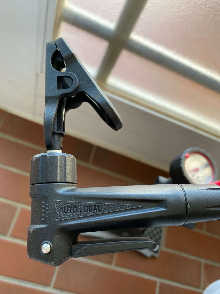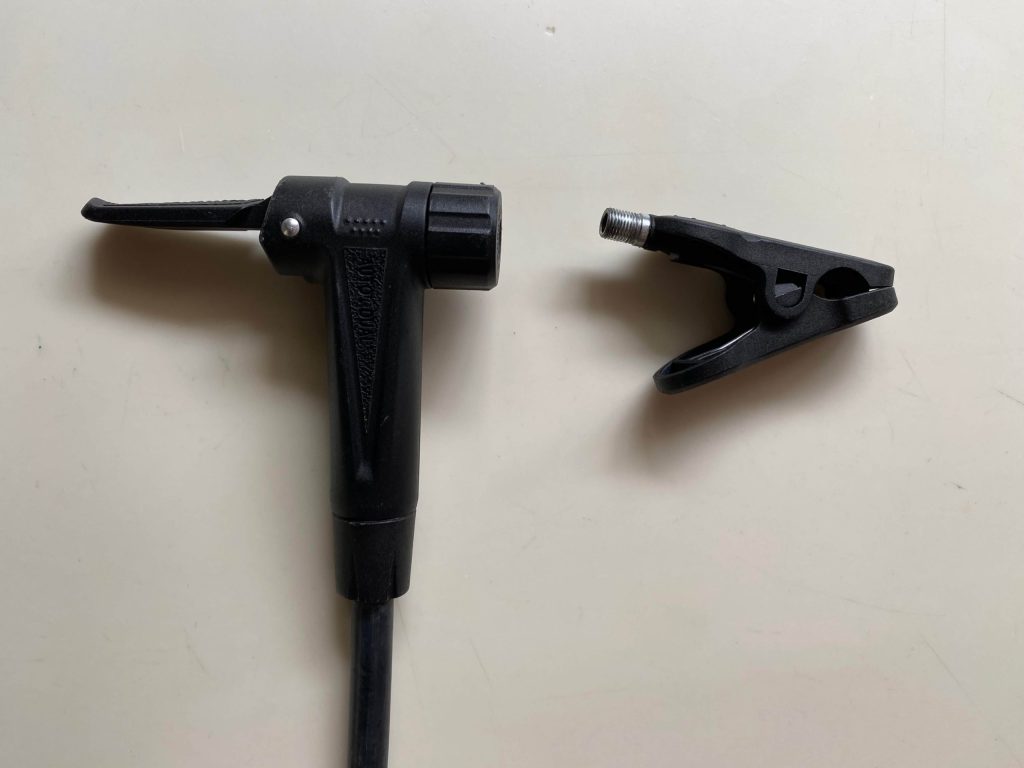 エアゲージでチェックして空気圧が減っているタイヤがあったら、パナレーサーを使い空気を補充します。まずは自転車用のアダプターを外しましょう。