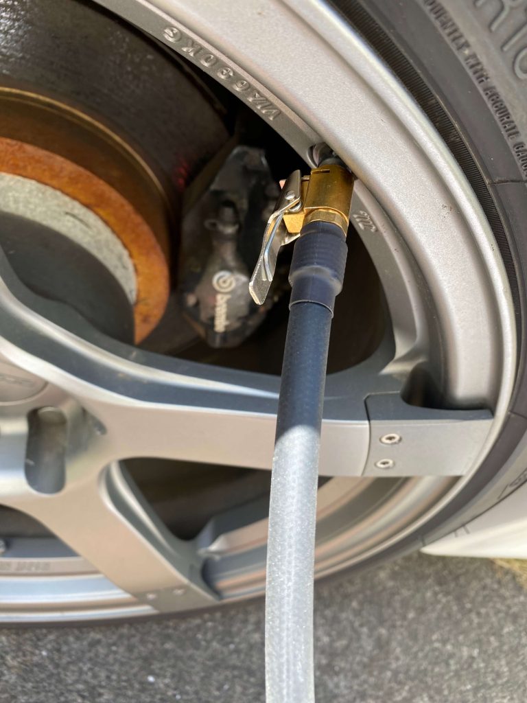 パナレーサーで車のタイヤの空気を入れる方法:アダプターを変えれば狭い隙間にもフィット