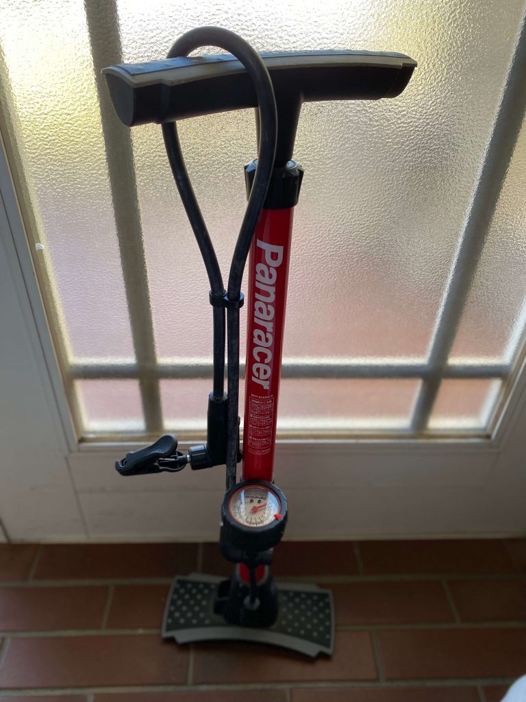 パナレーサーをポンピングして、タイヤに空気を入れます。パナレーサーにもエアゲージが付いているので大体の目安とします。
