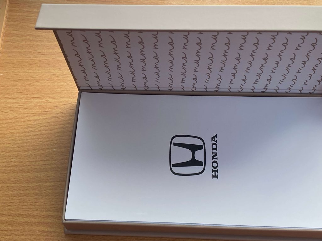 特別感のある専用の箱に入っています。ホンダのロゴが書かれたステッカーが貼ってあり、ライセンス商品であることを示しています。自動車メーカーの承諾を得た商品であることは、車好きにとっては嬉しいポイントです。