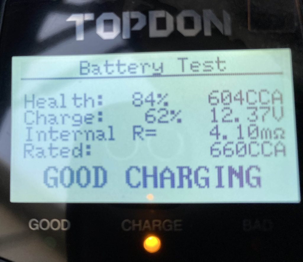 後日、トランクの内張を外してバッテリーに直接CCAテスターを繋いで測定してみました。測定された抵抗値は、「5.19mΩ」でフロント側で測定した値のおよそ5分の一です。計算式の分母が小さくなったので、当然CCA値は大きくなり「477CCA」となりました。どうやらバッテリーは生きているようです。