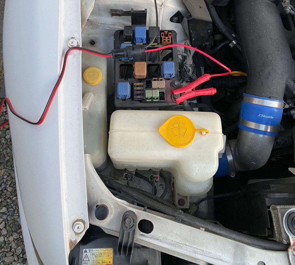 エンジンルームのヒューズボックスのカバーを開けて、プラスのターミナルに充電器の赤色のプラスクリップを挟み、マイナス側は充電器の黒色のマイナスクリップをボディーアースとしてストラットタワーのボルトなどに挟みます。