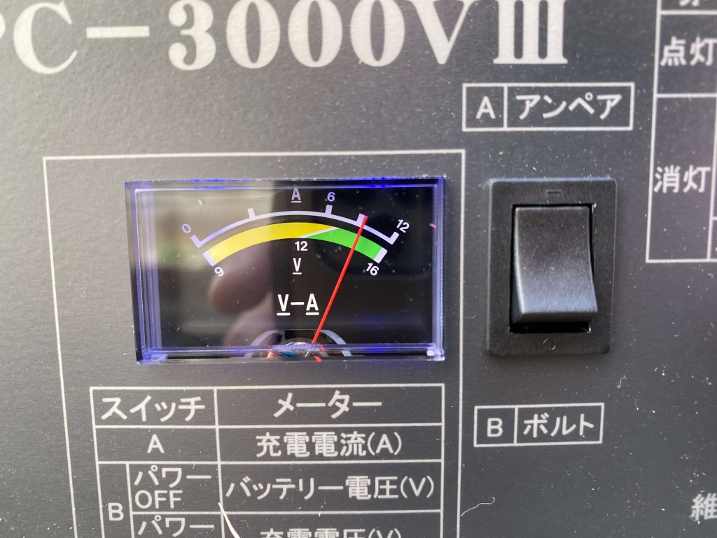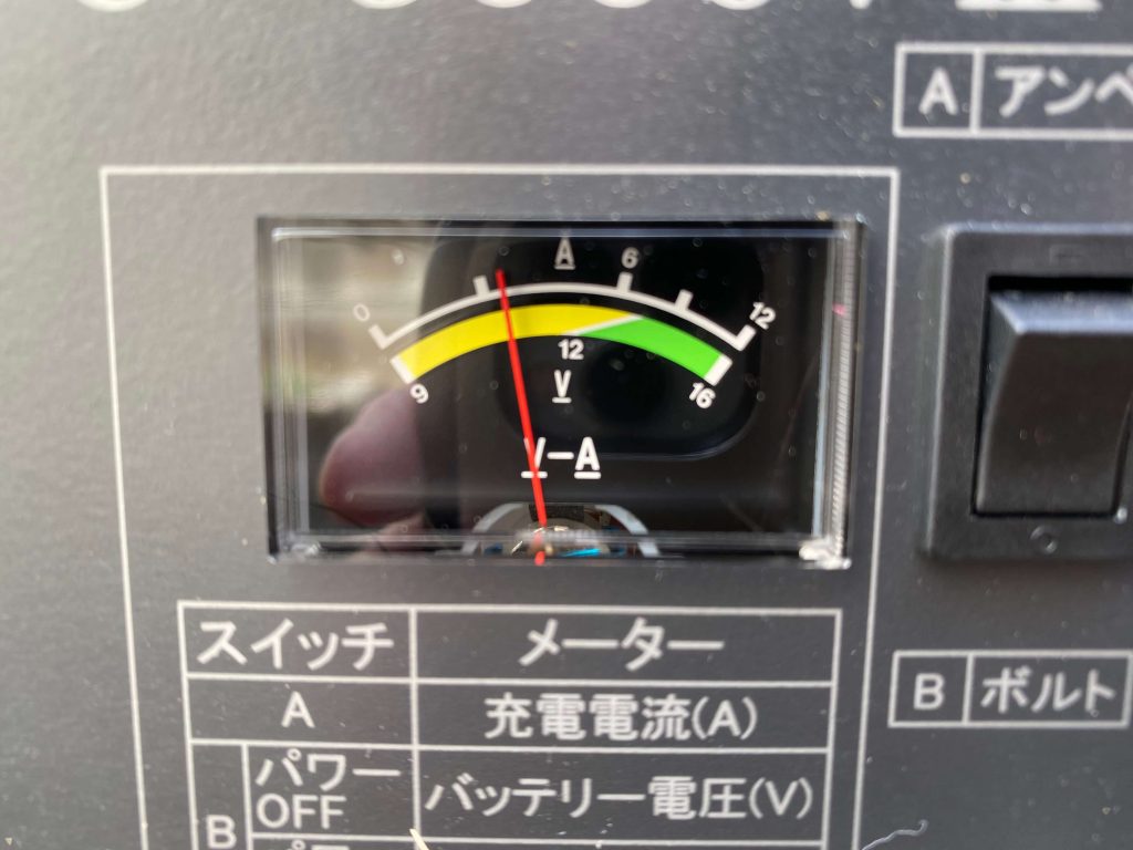 充電器の電源をONにして充電をスタートさせたら、電流値を確認しましょう。「アンペア」or「ボルト」切替スイッチを「アンペア」に切り替えます。この時、写真のようにメーターが右に大きく振れていれば、バッテリーは生きているので充電可能です。