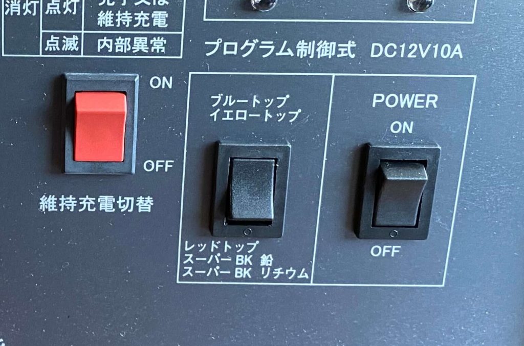 充電完了後に維持充電モードに移行したければ、維持充電切替スイッチをONにします。維持充電モードは、バッテリーに微弱な電流を流し続け、フル充電の状態をキープするモードです。筆者の充電環境の場合、充電器を繋ぎっぱなしにはできないので、何日かに分けて充電することになりそうです。そのため今回は維持充電モードをOFFでスタートします。