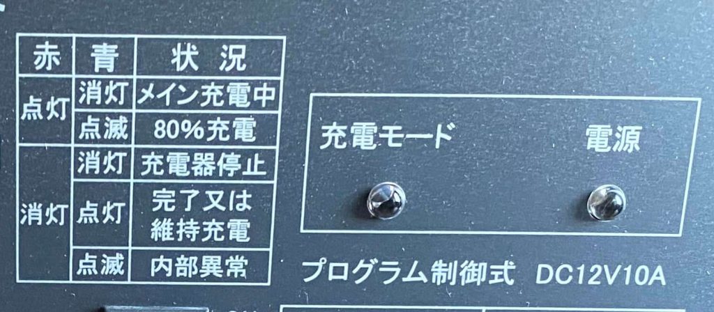 ランプの見方は、充電器本体前面に記されているので、この表を見て判断します。写真の「充電モード」が青ランプで、「電源」が赤ランプとして光ります。