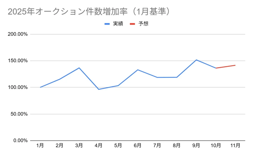 過去のデータに基づき、11月は9月並みとはいかずとも、10月よりも取引台数の増加が予想されています。(※予想値はセルカオークション出品「2023年10月~11月、2024年10月~11月」をもとに算出 実績値はセルカオークション出品「2025年1月~10月」をもとに算出)